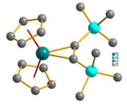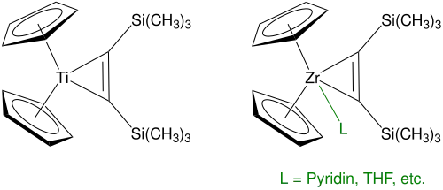 - ↑ Uwe Rosenthal, Vladimir V. Burlakov: Organometallic Chemistry of Titanocene and Zirconocene Complexes with Bis(trimethylsilyl)acetylene as the Basis for Applications in Organic Synthesis. In: Titanium and Zirconium in Organic Synthesis. Wiley-VCH Verlag GmbH & Co. KGaA, Weinheim, FRG, ISBN 3-527-30428-2, S. 355–389, doi:10.1002/3527600671.ch10.