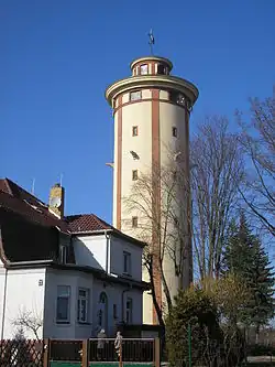 Das Wahrzeichen des Ortes ist der 41,5 Meter hohe Wasserturm aus dem Jahr 1917. Er diente zur Versorgung des Teerverarbeitungswerkes. Ebenfalls zum ehemaligen Teerverarbeitungswerk gehört das frühere Kulturhaus, die heutige Gemeindeverwaltung. Am bemerkenswertesten ist der 38 Meter breite Kopfbau mit flachem Walmdach und fünfachsigem Eingangsportal; daran schließt sich ein Saalflügel mit Bühnenhaus an.