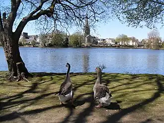 Blick über einen der Étangs de Rosporden zur Kirche Notre-Dame | ||