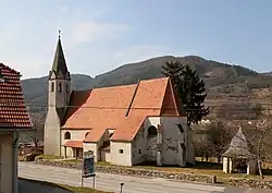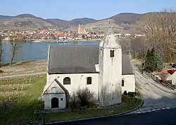 Filialkirche hl. Lorenz in St. Lorenz. Im Hintergrund Weißenkirchen in der Wachau.