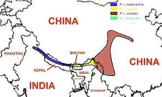 - P. r. whistleri (Stresemann, 1931)[4] (Südwestchina, Nordostmyanmar und Nordostindien)