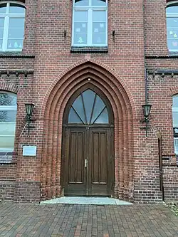 Das dreigeschossige Gebäude entstand im Wesentlichen aus rötlichen Backsteinen. Leicht ausmittig nach Osten hin ist ein turmartiger Vorbau mit einem großen, spitzbogenförmigen Portal. Nach Westen schließt sich ein sechsachsiger Flügel mit Klassenräumen an. Nach Osten ist ein dreiachsiger Flügel mit weiteren Klassenräumen und Gemeinschaftsräumen. Das Untergeschoss ist dabei mit einem Fries optisch vom übrigen Baukörper getrennt. Zwischen dem zweiten und dritten Geschoss ist im östlichen Flügel eine querrechteckige Blende mit drei darüber angeordneten, spitzbogenförmigen Blenden. Dort sind gedrückt-segmentbogenförmige Fenster mit einem darüberliegenden Ochsenauge eingelassen. Im Giebel ist ein gemauertes Kreuz. In dem turmartigen Mittelbau ist mittig eine Turmuhr.