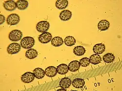 Die rundlichen bis breitellipsoiden Sporen messen 7,6–10,3 × 6,1–8,3 µm. Der Q-Wert (Quotient aus Sporenlänge und -breite) ist 1,1–1,4. Das Sporenornament besteht aus groben, bis zu 1 (1,2) µm hohen, teilweise verlängerten und überwiegend isoliert stehenden Warzen, die nur spärlich durch feine Linien miteinander verbunden sind. Der deutlich amyloide Hilarfleck ist unregelmäßig und misst etwa 3,5 × 3,25 µm.