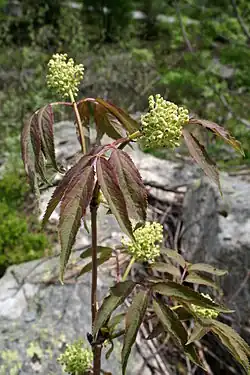 - Sambucus racemosa L. subsp. sieboldiana (Miq.) H.Hara f. stenophylla (Nakai) H.Hara (Basionym: Sambucus sieboldiana var. stenophylla Nakai, Syn.: Sambucus buergeriana (Nakai) Blume, Sambucus racemosa var. miquelii Nakai, Sambucus sieboldiana var. buergeriana Nakai, Sambucus sieboldiana var. miquelii (Nakai) H.Hara): Die Heimat ist Honshu.[5]