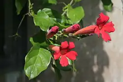 Der Rote Trompetenwein wächst als immergrüne, schnellwüchsige Kletterpflanze einige bis viele Meter hoch und weit. Es werden manchmal verzweigte Ranken an den Blattenden gebildet.