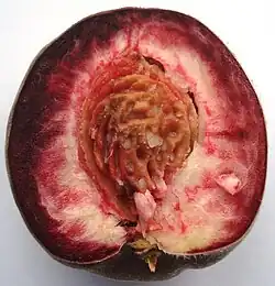 Die Sorte ist rot- bis tiefrotfleischig. Eine weitere Sorte des Weinbergpfirsichs ist der weiße, geschmacklich besteht jedoch kaum ein Unterschied. Diese Pfirsichsorten sind gegenüber dem normalen Pfirsich aromatischer, dafür weniger süß.