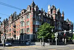 Das Rote Schloss in Zürich ist ein Wohn- und Geschäftshaus mit einer aussergewöhnlichen, schlossähnlichen Architektur im Stil des Historismus.