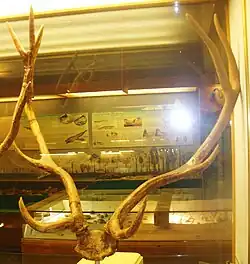 Das Geweih wächst nur den männlichen Tieren und wird je nach Lebensalter jährlich etwa im Februar bis April abgeworfen, eine Neubildung setzt kurzzeitig danach wieder ein und ist in circa fünf Monaten (140 Tagen) abgeschlossen. Der Geweihabwurf erfolgt umso eher, je älter das Individuum ist. Tiere mit großem Geweih bilden innerhalb dieser knapp vier Monate eine Knochensubstanz von vier bis fünf Kilogramm Gewicht aus.[18] Im Durchschnitt wird das Geweih 90 bis 105 Zentimeter lang (je Stange) und wiegt 6 bis 6,5 Kilogramm (einschließlich Schädel). Außergewöhnlich große Geweihe messen zwischen 130 und 140 Zentimeter und bringen 18 bis 21 Kilogramm auf die Waage.[1]