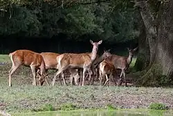 Die Rudel weiblicher Tiere mit ihren Jungen werden jagdlich Kahlwildrudel genannt. Sie setzen sich in der Regel aus mehreren Mutterfamilien zusammen, die jeweils aus einem Alttier, einem Jährling und einem Kalb bestehen. Kurz vor der Niederkunft mit dem neuen Kalb sondern sich die Muttertiere vom Rudel ab und vertreiben dann auch die ihnen folgenden Jährlinge. In der Regel schließen sich Jährlinge nach der Niederkunft wieder dem Muttertier an. Bei männlichen Jährlingen endet die Mutterbindung während des zweiten Lebensjahrs. Sie schließen sich einem Rudel aus männlichen Tiere an.[51] Der Zeitpunkt, ab dem die Mutterbindung weiblicher Jährlinge endet, ist weniger eindeutig. Die enge Bindung an das Muttertier endet beim Jungtier wahrscheinlich zu dem Zeitpunkt, zu dem es selbst erstmals ein Kalb wirft. Häufig verbleiben die weiblichen Nachkommen aber im weiteren Einstandsrevier ihrer mütterlichen Verwandtschaftslinie und bleiben mitunter sogar im selben Rudel zusammen.[52]