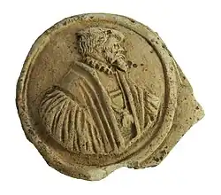 Die vielfältigen Darstellungen von Adeligen reichen vom deutschen Kaiser bis zu (wohl typisierten) Landadeligen. Eine ähnliche Darstellung eines Adeligen findet sich auf einem teilweise wieder zusammengesetzten Krug (Maße: H 17,5 cm, DB 7 cm, Dmax 11 cm, HDmax 8 cm, DÖ 7 cm) – hier wird deutlich, dass dieses Motiv am Hals der Krüge angebracht war.