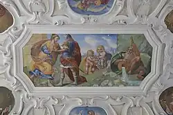 Das Deckengemälde im Vorraum stellt die Geschwister Apollo und Diana dar. In den kleineren Szenen sieht man Putten, die Pfeile und einen Bogen in Händen halten. Die ovalen Bilder weisen allegorische Darstellungen auf. Eine in einen goldfarbenen Umhang gehüllte und mit Getreideähren und Füllhorn dargestellte Frau kann als Sinnbild des Überflusses verstanden werden. Die Darstellung einer Frau mit Krone und Szepter und einem Füllhorn, das von Schmuck und Goldmünzen überquillt, ist eine Allegorie des Reichtums. Eine Frau, die zwei Schlangen in ihren Händen hält, steht für die Tugend der Klugheit. Eine weibliche Figur mit aufgedunsenem Gesicht und einem Krug in der Hand soll das Laster der Trunksucht symbolisieren.