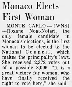 - ↑ a b c d e f g h Hommage a la memoire de Madame Roxane Noat-Notari, ancien conseiller national. In: Débats du Conseil National. Annexe au Journal de Monaco. 11. August 2006, S. 889, 890 (französisch, Digitalisat [PDF] Hommage in der öffentlichen Sitzung des Nationalrats vom 1. April 2004).