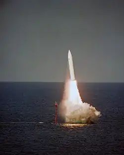 Im Jahr 1964, nachdem es 1963 gelungen war Polaris-Raketen in den Vereinigten Staaten zu kaufen, begann in Großbritannien zudem auch der Bau der ersten Atom-U-Boote mit ballistischen Raketen (SSBN);[65] bis 1969 wurden insgesamt vier Einheiten dieser neuen Resolution-Klasse in Dienst gestellt.[65] Am 15. Februar 1968 feuerte die Resolution, das Typschiff der Klasse, als erstes britisches U-Boot eine U-Boot-gestützte ballistische Rakete – eine mit einem 50-Kilotonnen-Atomsprengkopf ausgestattete Polaris-Rakete – auf ein Atomwaffentestgelände in den Vereinigten Staaten ab. Die in getauchtem Zustand über 8.000 ts verdrängenden U-Boote der Resolution-Klasse, jedes der Boote führte 16 Raketen mit sich, bildeten für knapp 30 Jahre, bis Mitte der 1990er Jahre, das Rückgrat der britischen atomaren Abschreckung. Alle vier U-Boote, die jeweils zwei Besatzungen besaßen, waren in Faslane-on-Clyde (His Majesty’s Naval Base Clyde) stationiert.[66] Alle Boote wurden im Verlauf der 1990er Jahre von den U-Schiffen der Vanguard-Klasse abgelöst.