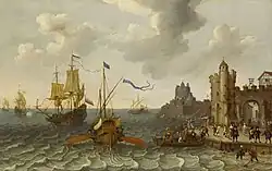 Eine französische Galeere (vorne, ohne gesetzte Segel) und eine niederländische Galeone (links) vor einem Hafen, Gemälde von Abraham Willaerts aus dem 17. Jahrhundert