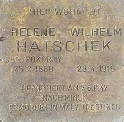 - Vor dem letzten Wohnsitz der Familie Hatschek in der Bahngasse 18 in Wien-Liesing wurde im November 2014 von der Initiative Steine der Erinnerung in Liesing ein Erinnerungsstein für Helene und Wilhelm Hatschek verlegt, die beiden Namen findet sich auch in der Liste Liesinger Opfer des Nationalsozialismus 1938–1945.[7]