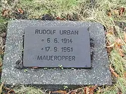 Rudolf Urban war das vierte namentlich bekannte Todesopfer an der Berliner Mauer und wurde auf dem Dorotheenstädtischen Friedhof II beigesetzt. Auch wenn er der vierte bekannte Todesfall ist, das Datum seines Fluchtversuchs, 19. August 1961, steht vor den Daten der drei ersten Fluchtversuche und deren unmittelbar resultierenden Todesfälle (Ida Siekmann, Günter Litfin und Roland Hoff).[5] An sein Schicksal und an das Schicksal neun weiterer Opfer in der Bernauer Straße erinnert ein Gedenkstein an der Bernauer Straße, nahe der Swinemünder Straße, den das Bezirksamt Wedding 1982 aufstellen ließ.[1]