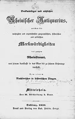 - Christian von Stramberg: Denkwürdiger und nützlicher Antiquarius, welcher die wichtigsten und angenehmsten geographischen, historischen und politischen Merkwürdigkeiten des ganzen Rheinstroms, von seinen Ausflügen in das Meer bis zu seinem Ursprünge darstellt. Coblenz: Rudolph Friedrich Christian Hergt (Weiterführung der Serie ab 1863 ff.)