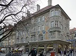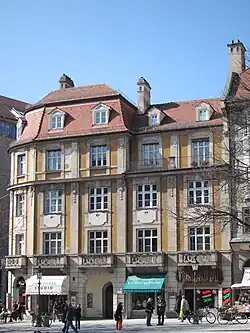 Das Eckhaus im Südwesten ist am Spätbarock orientiert. Die Schaufensterfront ist durch rundbogige Vordächer gegliedert, die wie Arkaden wirken. Ein Erker mit Loggia im Süden grenzt den Bau vom Nachbar ab. Die Fassaden des ersten und zweiten Obergeschosses sind durch Pilaster mit reichhaltigen Konsolen und Kapitellen gegliedert, die jeweils zwei Fenster zusammenfassen, nach einem umlaufenden Gurtgesims setzen sich die Pilaster im dritten Obergeschoss fort. Ursprünglich wies der Eckbau zwei Volutengiebel auf, die nach dem Zweiten Weltkrieg nicht wieder errichtet wurden.