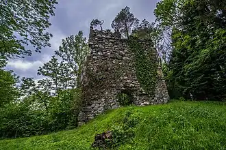 Im früheren Zentrum der Kernburg stand frei der Bergfried, allerdings ist durch mehrere Bergrutsche der Westteil der Kernburg sowie der des Bergfriedes zerstört worden. Vom Bergfried hat sich nur noch die ruinöse, 12,20 Meter lange Ostseite erhalten, sie besteht aus lagerhaften Mauerwerk mit unterschiedlichen Bruchsteinformaten und noch teilweise erhaltener Eckquaderung. Die Kernburg ist von einer Ringmauer umgeben, in deren Südseite ein Wohngebäude, möglicherweise der Palas,[3] eingebunden war.