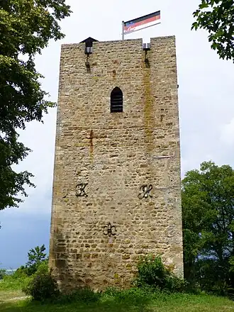 ![]() Der erneuerte Bergfried der ehemaligen Burg Achalm | ||
