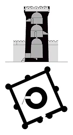 Die Burg besteht aus einem runden Wohnturm mit drei Geschossen, der von einer nahezu quadratischen Mauer umgeben ist. Die Eingänge zum Hof und zum Turm sind gegeneinander versetzt, um besseren Schutz zu bieten.