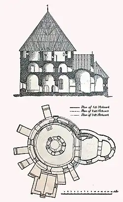 Die Rundkirche besteht aus drei Ebenen. Die unterste Ebene bildet den Kirchenraum (das Rundschiff). Die beiden oberen Stockwerke sind nur durch enge, gut zu verteidigende Aufgänge erreichbar. Die zweite Etage diente als Schutzraum für die Bevölkerung und in Friedenszeiten als Lagerraum für die Bauern. Sie war zunächst mit einer flachen Holzbalkenschicht gedeckt. Diese wurde wohl schon vor 1200 durch eine Steinkonstruktion ersetzt. Um diese verlief ein ursprünglich offener Wehrgang für die Verteidigung gegen Angreifer mit Schießscharten und Speigatten zum Ablauf des Regenwassers.