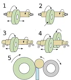 Ohne Aufspannung arbeiten große Walzenschleifmaschinen.[2] Wegen der großen Gewichte (> 200 t) werden die Walzen nicht eingespannt, sondern in Schleif-Lünetten gelagert. Vor dem Schleifen des Walzenballens müssen an den vorgedrehten Lagerstellen präzise Rundläufe angeschliffen werden, weil sich Rundlauffehler auf das Schleifergebnis auswirken würden. Zur Sicherstellung einer präzisen Zylinderform des Walzenballens wurde die Zweischeiben-Schleifmaschine erfunden,[3] bei welcher die Scheiben mit einem einstellbaren Abstand zueinander auf einem quer zur Walzenachse frei beweglichen Schlitten montiert sind. Damit können sich Fehler in den Führungen nicht auf die Form auswirken. Mit der Möglichkeit zur Bahnkorrektur mit elektronischen Steuerungen wurde diese Bauform obsolet.
