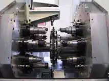 Die Spannung der Werkstücke kann mit einseitig oder zentrisch spannenden Spannbacken oder Spannzange erfolgen. Der Schaltteller taktet von Bearbeitungsstation zu Bearbeitungsstation, an denen die stehenden, nicht rotierenden Werkstücke gleichzeitig mit angetriebenen Werkzeugen (Angetriebenes Werkzeug) bearbeitet werden. Bei der klassischen Drehmaschine rotiert das Material bzw. Werkstück und die Werkzeuge sind nicht angetrieben.