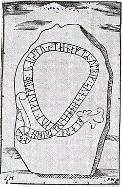 Die Schrift, die auf den Beginn des 10. Jahrhunderts zurückgeht, ist die älteste bekannte Quelle, in der der Name Finnland enthalten ist. Der Stein hat ein Schlangenband ohne Irisches Koppel und christliches Kreuz.