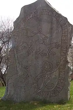 Der Runenstein aus der Wikingerzeit (800–1050 n. Chr.) hat eine zentrale Verzierung aus zwei Tieren mit gekreuzten Beinen, die an der Stelle des ansonsten häufigen Kreuzes stehen. Die Tiere werden durch ein beschriftetes Schlangenband mit einer Schlange mit grotesk offenem Maul und einem irischen Koppel gerahmt. Der dünne Runenstein aus Granit ist etwa 3,0 Meter hoch und 2,0 Meter breit.