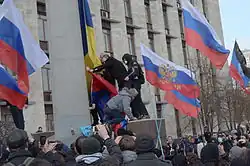 Nach den Ereignissen des Euromaidan kam es in Regionen mit einem hohen Anteil russischstämmiger Bevölkerung zu Protesten und separatistischen Aktivitäten, welche von Russland unterstützt wurden. Russland annektierte 2014 die mehrheitlich von Russen bewohnte Halbinsel Krim, und zwar mit der Begründung, die russische Bevölkerung dort „beschützen“ zu müssen. Die prorussischen Proteste in den Oblasten Donezk und Luhansk eskalierten zu einem bewaffneten separatistischen Aufstand.[15] Diese Ereignisse führten zu einem Zusammenbruch der russisch-ukrainischen Beziehungen und Bemühungen zu einer Ukrainisierung durch folgende ukrainische Regierungen z. B. durch das Verbot russischer Kulturimporte und der russischen Sprache im Bildungswesen.