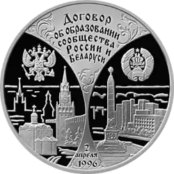 Gedenkmünze zur Unterzeichnung des „Vertrags über die Bildung der Gemeinschaft Russlands und Belarus'“ am 2. April 1996.