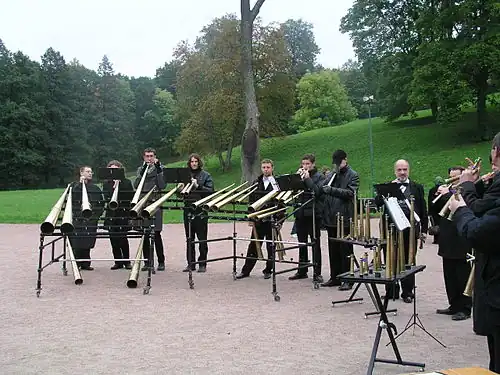 - ↑ a b c Infoheft zu einer Musik-CD: Russian Horn Capella, hrsg. 2008 durch die Russisch-Horn-Kapelle mit Unterstützung durch die russische Staatliche Universität A. I. Herzen aus St. Petersburg.