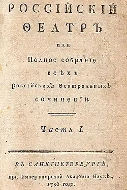 - ↑ Bzw. «Российский феатр» или «Полное собрание всех Российских Феатральных сочинений» in moderner Orthographie.