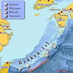 Die Ryūkyū-Inseln (veraltet Riukiu-Inseln oder Liukiu-Inseln; japanisch 琉球諸島, Ryūkyū-shotō, dt. „Ryūkyū-Inselgruppe“) sind eine zu Japan gehörende Inselgruppe im Ostchinesischen Meer (Pazifischer Ozean) südwestlich von Japan, die sich über 1200 km zwischen Kyūshū und Taiwan erstreckt. Die Ryūkyū-Inseln sind gleichzusetzen mit den Nansei-Inseln, die seit 1970 als politische Region existieren.[1] Alle Inseln ohne die abgelegenen Daitō- und die Senkaku-Inseln werden als Ryūkyū-Inselkette (琉球列島, Ryūkyū-rettō) bezeichnet.