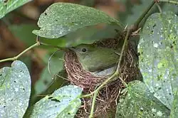 Das Männchen dieser Art hat einen schwarzen Rücken und schwarze Flügel. Die Schwanzoberseite und der obere Teil des Kopfes sind ebenfalls schwarz. Der Schnabel ist silbern, die Beine sind orange. Der Bauch, die Kehle und der Großteil des Kopfes sind weiß. Das Weibchen ist in einem schlichten Olivgrün gefärbt.