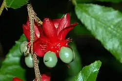 Meist stehen fünf bis sechs Früchte zusammen. Die mehr oder weniger kugelrunden, beerenartigen Steinfrüchte sind zunächst grün und werden zur Reifezeit im frühen Sommer (November) glänzend schwarz. Bis zur Reifezeit der Früchte vergrößern sich die kräftig leuchtend-roten Kelchblätter. Da die Kelchblätter bis zum Spätsommer (Januar bis Februar) am Strauch bleiben, erscheint der ganze Strauch mehrere Monate lang auffällig rot. Die reifen, schwarzen Früchte werden von Vögeln gefressen.