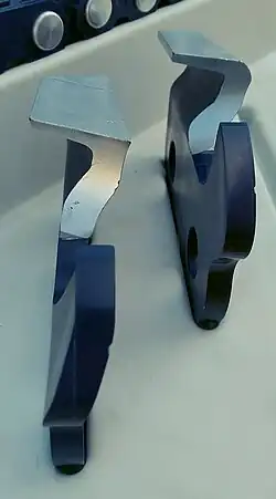Die Winkel an den Schneidegliedern sind für das Arbeitsergebnis und die Betriebssicherheit sehr wichtig.[2] So werden üblicherweise in den Unterlagen zu jeder Kettensäge und auch in den Unterlagen zu jeder Sägekette die folgenden Winkel explizit vorgegeben: Seitenplatten-Feilwinkel oder Schärfwinkel (80 – 85 – 90°), Zahndachwinkel oder Dachschneidenwinkel (30 – 35°), Brustwinkel (keine Angabe) und Feilführungswinkel (90°). In den Klammern stehen typische Beispielwerte.[3] Diese Angaben sind wichtig, denn normalerweise wird die Sägekette vom Benutzer mehrfach nachgefeilt, also geschärft und von Beschädigungen aus dem Betrieb befreit, was durch die verschiedenen Winkel in mehreren Dimensionen nicht trivial ist. Die Industrie bietet daher verschiedene Schärfhilfen an, z. B. in Form von Lehren, welche magnetisch unter der Feile angebracht werden und dem Benutzer eine optische Vorlage zeigen.