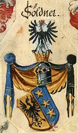 Die Söldner von Söldenhofen waren ein geadeltes Patriziergeschlecht aus der Reichsstadt Eger. Die reichsritterliche Familie besaß dort das Haus Nr. 60, außerdem das Dorf Stadl und mehrere andere Höfe. Am 30. August 1630 wurden die Vettern, der kaiserliche Reichshofratssekretär Johann und Johann Heinrich, Georg Adam sowie deren Neffe Johann Christoph Söldner mit dem Prädikat "von Söldenhofen" in den Ritterstand erhoben. Damit verbunden erhielten sie eine Wappenbesserung und die Lehensberechtigung.[1] Der Vetter des kaiserlichen Rates, Dr. jur. Johann Söldner von Söldenhofen, Johann Heinrich Söldner von Söldenhofen diente ebenfalls als kaiserlicher Rat, niederösterreichischer Regierungssekretär und Registrator.[2]