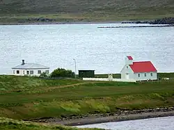 Auf dem geschichtsträchtigen Hof Vatnsfjörður, der sich am gleichnamigen Fjord zwischen Mjói- und Ísafjörður befindet, steht auf der Landspitze Vatnsfjarðarnes die 1911–1912 für 60 Personen erbaute Steinkirche Vatnsfjarðarkirkja.[11] Viele ihrer Kunstwerke sind heute im Isländischen Nationalmuseum ausgestellt. Nach der Reformation war die Vatnsfjarðarkirkja Pfarrkirche für einen der größten Bezirke Islands. Links vom Altar hängt ein großes Kreuz, das von dem 1888 verstorbenen Bildhauer Guðmundur Pálsson geschaffen wurde. Das Altargemälde mit der Jahreszahl 1860 wurde in Dänemark gestaltet und zeigt die Auferstehung Christi. Die seit 1990 denkmalgeschützte Kirche mit ihrem markanten Dachreiter weist eine Länge von 9,51 m und eine Breite von 5,69 m auf.[12]