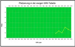 | 9 WM-Spiele 2 Siege 4 Unentschieden 3 Niederlagen 11:16 Tore | |