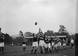 Der Erste Weltkrieg machte internationale Rugbytouren unmöglich. Mit der Australasientour 1921 begann die bis heute andauernde Rivalität zwischen den südafrikanischen Springboks und den All Blacks aus Neuseeland. Die beiden Teams galten mittlerweile als die besten der Welt, waren aber bisher noch nie gegeneinander angetreten.[37] Aus diesem Grund wurde die Tour der Springboks nach Australien und Neuseeland auch als „Rugby-Weltmeisterschaft“ bezeichnet.[38] Die aus drei Test Matches bestehende Serie endete ausgeglichen mit je einem Sieg, einem Unentschieden und einer Niederlage.[39] Der Gegenbesuch der All Blacks folgte 1928, auch diese Serie endete ausgeglichen.[40]