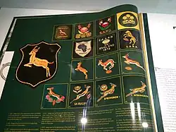 Der Spitzname der Springboks entstand während der Tour von 1906/07 auf die Britischen Inseln. Der damalige Kapitän Paul Roos wählte den Springbock als Logo aus, um zu verhindern, dass die britische Presse einen eigenen Spitznamen für die Südafrikaner erfand. Das Logo war nicht nur für die damalige „weiße“ Mannschaft gedacht – das Springboklogo wurde 1939 von der ersten „farbigen“ Mannschaft verwendet und 1950 von der ersten „schwarzen“ Mannschaft.[171] Nach dem Ende der Apartheid fügte man 1992 dem Logo eine stilisierte Blüte der Protea hinzu. Nach dem Sieg des ANC bei den ersten demokratischen Wahlen für alle Südafrikaner im Jahr 1994 wurde auf Initiative des damaligen Präsidenten Nelson Mandela der Spitzname der Rugbymannschaft im Gegensatz zu dem der Cricket-Nationalmannschaft nicht in „Proteas“ geändert.[171][172] Gelb/gold und grün sind die nationalen Sportfarben Südafrikas und finden sich auch auf der Landesflagge.[173]