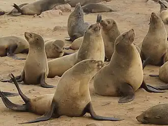 In den Kolonien an Land erbeuten vor allem Schabrackenschakale (Lupulella mesomelas)[12] und Schabrackenhyänen (Parahyaena brunnea)[13] Jungtiere der Seebären.[1] Schakale im Bereich der Kolonien in Namibia sind weitgehend abhängig von den Robben als Nahrungsquelle. Während der Wurfzeiten sind reichlich Robbenplazentas und tote Jungtiere vorhanden, danach müssen die Schakale aktiv Jungtiere töten. Nach Untersuchungen 1997 im Van Reenen Bay Cape in Namibia werden jährlich schätzungsweise 1770 Jungrobben von Schakalen getötet oder erbeutet, das entspricht 35,7 % der in der Kolonie geborenen Jungtiere. Dieser Raubdruck wird als Grund angenommen, dass sich neue Kolonien vor allem auf Inseln und weniger am Festland bilden.[12] Hyänen nutzen die Kolonien ebenfalls zur Nahrungssuche, ernähren sich allerdings vor allem von Aas und toten Tieren, nur gelegentlich töten sie Jungtiere, wenn sich die Gelegenheit bietet.[13]