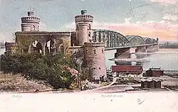 Zehn Jahre später waren die Verkehrslasten weiter gestiegen. Außerdem entsprach das Lichtraumprofil der Brücke nicht mehr den inzwischen gültigen Normalmaßen und war um einige Millimeter zu knapp bemessen.[9] So wurden 1911 sämtliche Überbauten erneuert[10]: Über den vier Hauptöffnungen wurden stählerne Halbparabelträger mit Stützweiten von 104,96 m montiert, die Vorlandbrücken erhielten Fachwerkträger und Blechträger für zwei kürzere Vorbrücken.[3] Die Brückenportale zwischen den Brückentürmen wurden im Oktober 1910 abgebrochen. Die Bauarbeiten wurden am 6. Mai 1910 begonnen, die Fertigstellung erfolgte am 1. Juli 1912. Das nördliche Gleis konnte bereits am 12. Juli 1911 in Betrieb genommen werden, die Aufnahme des zweigleisigen Betriebs erfolgte am 4. Juli 1912.