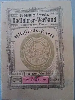 - ↑ vgl. Twitter: Mitgliedskarte 1907 des Süddeutsch-Schweiz. Radfahrer-Verbands, @velohonig, 7. Januar 2017.