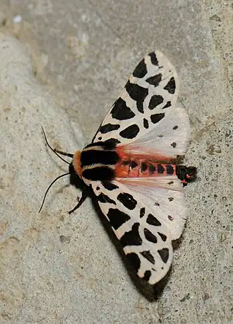 Die Falter besitzen eine Flügelspannweite von 35 bis 42 Millimetern bei den Männchen und von 37 bis 43 Millimetern bei den Weibchen.[1] Ihre Vorderflügel haben eine milchigweiße bis rosaweiße Grundfärbung, die von einer schwarzen Fleckenzeichnung unterbrochen ist. Im Saumbereich sind die Flecke meist dreieckförmig. Die Intensität der Fleckenzeichnung kann stark variieren. In der Postdiskalregion der rosaweißen Hinterflügel sind einige runde, schwarze Flecke erkennbar. Der schwärzlich behaarte Thorax ist durch eine breite, gelbliche Halskrause sowie zwei gelbweiße Längsstreifen beidseitig der Mitte charakterisiert. Arttypisch ist die rote Farbe des Hinterleibs, der einige dunkle Flecke aufweist. Die Fühler der Männchen sind bewimpert, diejenigen der Weibchen sind fadenförmig.