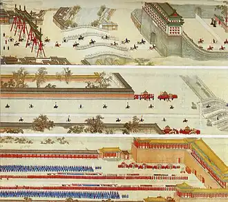 Von den aufgereihten elf Elefanten am Straßenrand haben die ersten vier traditionell die Funktion, die Straße frei zu räumen, die fünf folgenden tragen als ein Friedenssymbol goldene Vasen auf dem Rücken. Daneben sind vier große kaiserliche Kutschen aufgereiht. Der Anfang der Reiterkolonne überquert gerade die Liangshui-Brücke. Das Spalier der Paradetruppe endet vor dem Südlichen Jagdpark, wo sich der Kaiser als erste Station aufhalten wird. In der Realität betrug die gemalte Wegstrecke etwa sieben Kilometer.