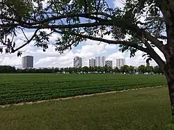 Westlich der Baierbrunner Straße liegt gegenüber der Südseite im Norden ein Gewerbegebiet mit einem Siemens-Rechenzentrum, dem neuen chinesischen Generalkonsulat und mehreren privaten Bildungseinrichtungen. Im Süden gegenüber steht das 75 m hohe Siemens-Hochhaus mit 23 Stockwerken leer, umgeben von ebenfalls leer stehenden Bürogebäuden aus der Siemenszeit. Das einzige genutzte Gebäude im Süden ist ein privates Studentenwohnheim mit gehobenem Standard.[6]