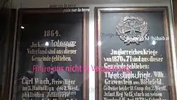 An die gefallenen Gemeindemitglieder des Ersten und Zweiten Weltkriegs sowie des Deutsch-Französischen Krieges als auch Kolonialkriege erinnern zwei Gedenktafeln im Eingangsbereich. Vor den kriegsverherrlichenden Gedenktafeln wurden 2019 von der Gemeinde eine Glastafel mit pazifistischen und antimilitaristischen Sprüchen angebracht. Angeregt wurde diese Veränderung durch einen Brief von Schülern der Hans-Ehrenberg Schule.[2]